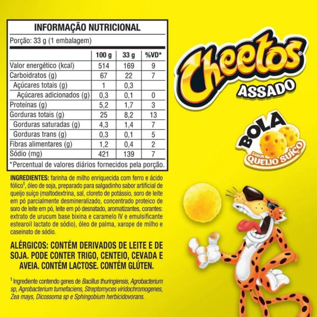 CHEETOS® é a marca líder no mercado de salgadinhos no Brasil, logo, no segmento de extrusados. Feito à base de milho, assado e sempre entrega uma explosão de sabor. Sempre traz inovação e diversão entre amigos e família com os deliciosos salgadinhos e o querido Chester Cheetah®. Alérgicos: Contém Soja, Trigo, Centeio, Cevada, Aveia e Leite. Contém lactose. Contém glúten. Ingredientes: Farinha de trigo enriquecida com ferro e ácido fólico, óleo vegetal, óleo vegetal de palma, Sal, Cloreto de potássio, Maltodextrina, Realçadores, Aromatizantes, Ácido lactino, e Emulsificante. Somos uma loja especializada em artigos de festa, confeitaria, embalagens e doces com lojas físicas no estado de São Paulo, desde 2002. Imagens meramente ilustrativas, de acordo com nossos fornecedores que nos fornecem. Todas as Informações divulgadas são de responsabilidade do fabricante/fornecedor.