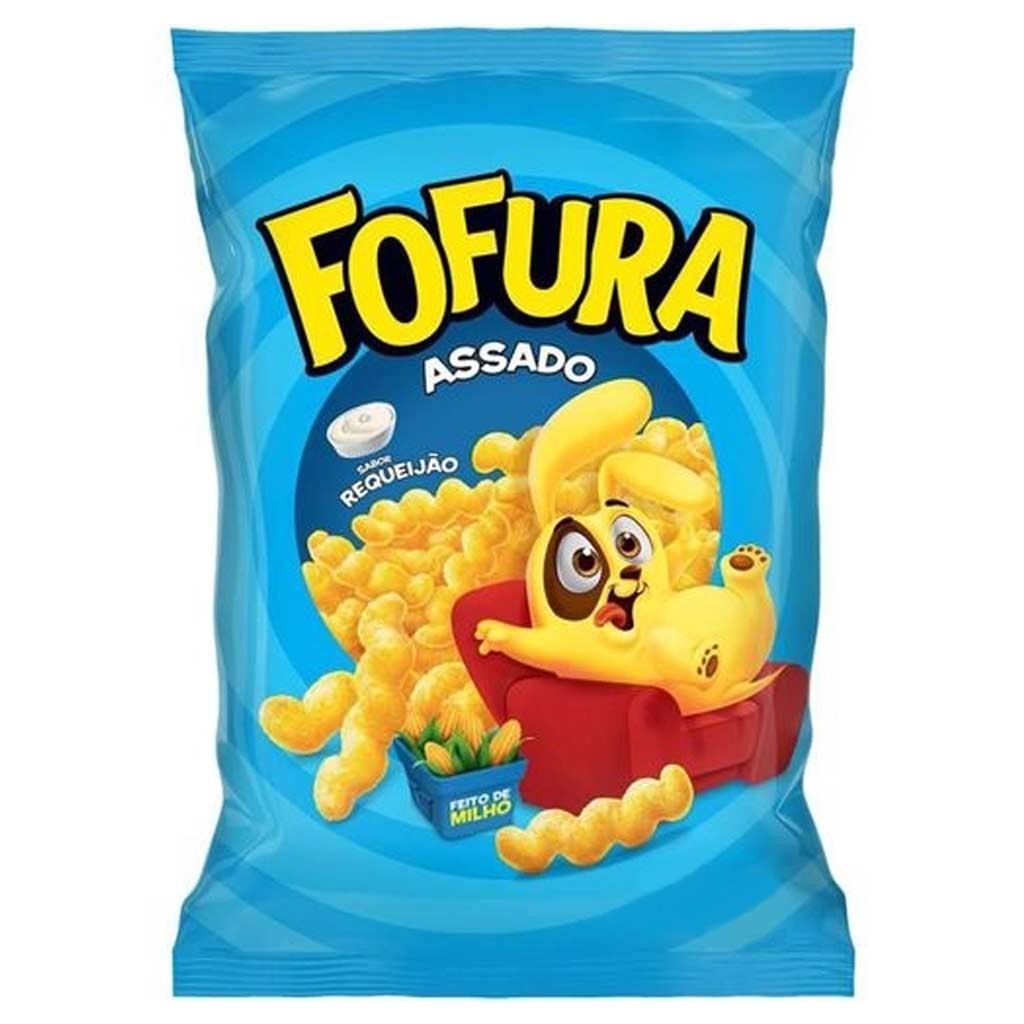 Fofura Requeijão com 10 unidades de 60gFarinha de milho enriquecida com ferro e ácido fólico*, óleo de soja, preparado para salgadinho sabor queijo (soro de leite, xarope de glicose, óleo de palma, sal, cloreto de potássio, aromatizantes e corantes: extrato de urucum e curcumina) e sal. *Ingrediente contendo genes de agrobacterium tumefaciens, agrobacterium sp, bacillus thuringiensis, streptomyces viridochromogenes, sphingobium herbicidovorans, zea mays e dicossoma sp.