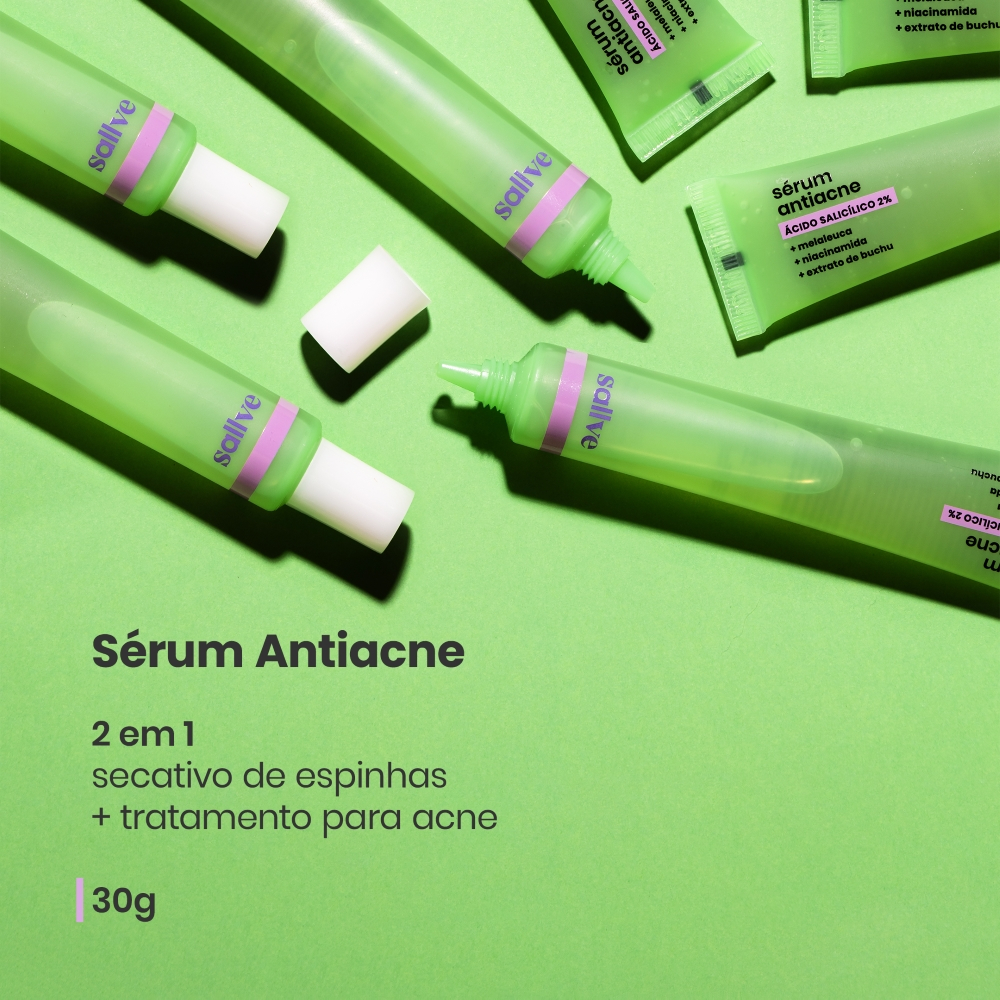sérum-gel com Ácido Salicílico, que trata e previne acne sem ressecar, seca espinhas nas primeiras 24h e também controla oleosidade e presença de bactérias causadoras da acne. além disso, desobstrui e minimiza poros dilatados. pode ser usado pela manhã ou à noite. durante o dia, use sempre protetor solar. o que só ele faz? . controla e reduz a oleosidade . reduz a inflamação e vermelhidão da acne . melhora cicatrizes e manchas de acne . previne o aparecimento de espinhas e cravos . reduz a presença das bactérias causadoras da acne como usar essa fórmula? 1. limpe o rosto com seu produto de limpeza facial. 2. você pode aplicar, uma vez ao dia, seu Sérum Antiacne nas áreas do rosto e do corpo com tendência a acne como tratamento ou prevenção. 3. você pode usá-lo pontualmente na espinha como secativo 4. evite sempre a área dos olhos. durante a primeira semana de uso, use em dias intercalados e evite usar produtos com alta concentração de ativos antes ou depois dele. 5. use sempre proteção solar durante o dia enquanto estiver tratando sua pele.