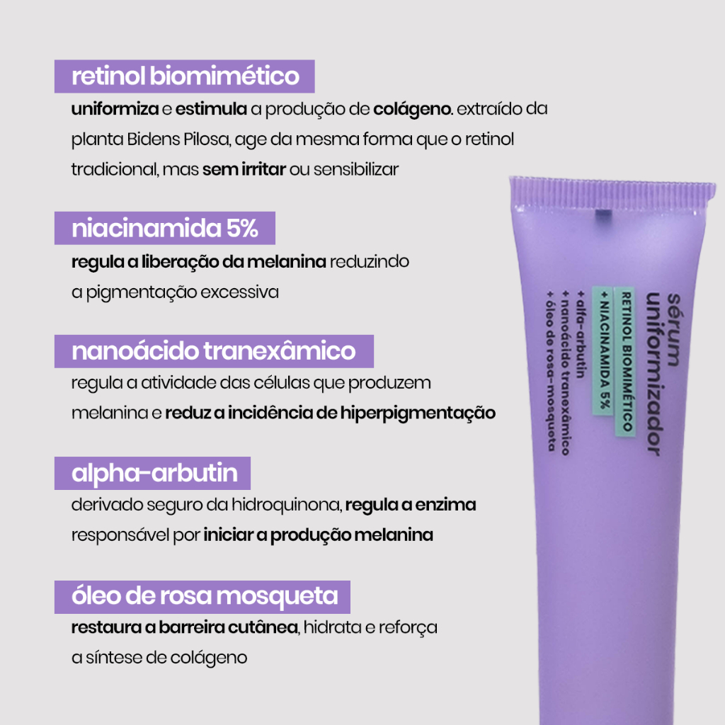 uma fórmula multifuncional testada em peles sensíveis, poderosa no tratamento e prevenção de hiperpigmentação, olheiras pigmentares e linhas finas. combina retinol biomimético, responsável por uniformizar textura e tom sem sensibilizar. a niacinamida 5% que reduz a pigmentação excessiva. o nanoácido tranexâmico e o alpha-arbutin, que regulam o início da produção da melanina. e óleo de rosa mosqueta, um antioxidante com ação hidratante e cicatrizante. fórmula única que trata todos os níveis da hiperpigmentação sem agredir a pele, sendo compatível até para peles sensíveis. ideal para área dos olhos, rosto e corpo. o que só ele faz? . uniformiza o tom, reduzindo as marcas da pele . testado em pele sensível . uniformiza textura, melhorando linhas finas . tem alto poder de hidratação . aumenta a luminosidade . liberado para todos os tipos e tons de pele como usar essa fórmula? 1. limpe o rosto com seu produto de limpeza facial. 2. aplique o Sérum Uniformizador ✔ 3 a 4 gotinhas são uma boa medida. ✔ espalhe ao redor dos olhos e em todo o rosto até o pescoço massageando em movimentos circulares até a total absorção. ✔ use sempre proteção solar durante o dia enquanto estiver tratando sua pele. ✔ dica: você pode usar também nas axilas, virilhas e todo corpo.