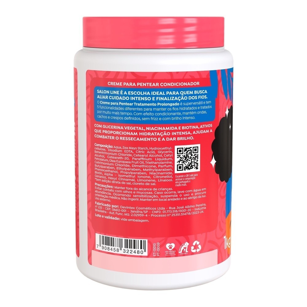 Tratamento 5 em 1! O Creme para Pentear Tratamento Prolongado 5 em 1 é superversátil e tem 5 funcionalidades diferentes para manter os fios hidratados e tratados por muito mais tempo. Desenvolvido para cabelos ondulados, cacheados e crespos, o produto é indicado para fios desnutridos, sem definição, sem volume, ressecados e em transição. Ativos nutritivos. O Creme para Pentear para cabelos ondulados, cacheados e crespos possui Glicerina Vegetal, Niacinamida e Biotina. Sua formulação condicionante mantém os fios hidratados e tratados por muito mais tempo, sem frizz e com brilho intenso. Modo de uso. Você pode utilizar o Creme para Pentear como pré-shampoo, máscara de tratamento, creme noturno e creme para pentear! Veja mais detalhes de aplicação na descrição do produto. Meu cabelo diz tudo. A Salon Line é especialista em valorizar sua beleza única, por isso, estamos presentes em cada momento transformador da sua jornada: do interior, até o último fio de cabelo. - Produto vegano; - Uso recomendado a partir de 12 anos; - Formulado especialmente para seu tipo de cabelo; - O cuidado diário que seu cabelo precisa; - As imagens podem ser ilustrativas.