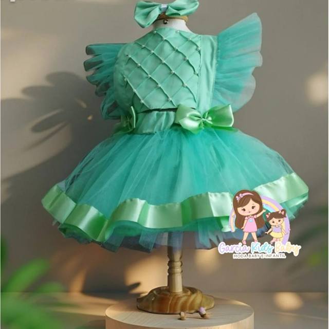 Tecido 100% poliéster Regulagem na alça Saia de tecido , com tule 2 camadas por cima Acompanha faixa do cabelo . P.S este modelo acompanha apenas o laço do cabelo. Medidas aproximadas: 6/18 meses 23 cm cintura ( medir somente a frente) 45 cm ombro a barra 2/3 anos 25 cm cintura ( medir somente a frente) 50 cm ombro a barra 3/4 anos 28 cm cintura (medir somente a frente ) 55 cm ombro a barra 10 de 6/18 meses 10 de 2/3 anos 10 de 3/4 anos