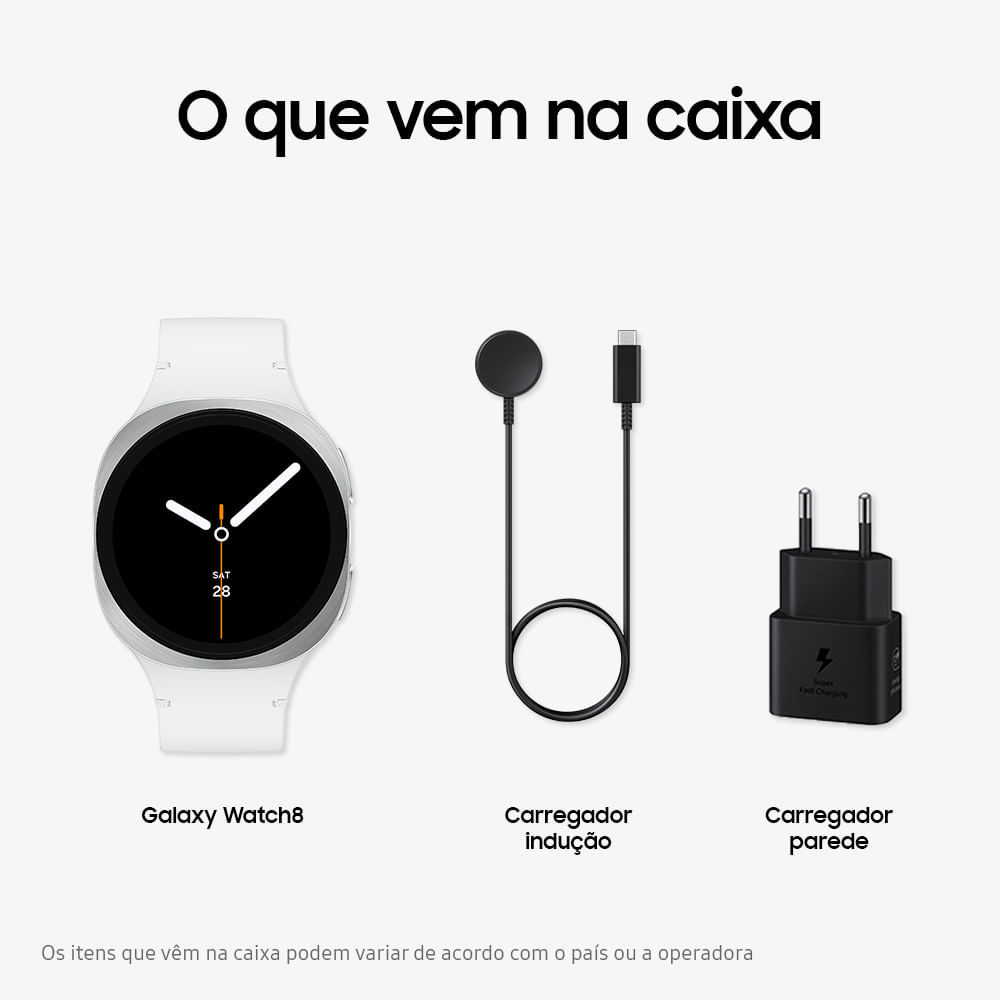 Samsung Galaxy Watch8 Smartwatch 44mm BT, Galaxy AI, Tela em Cristal de Safira, GPS de Dupla Frequência, Monitoramento avançado de saúde, sono e de coração, Processador de 3nm O Watch8 é mais do que um simples acessório, é uma expressão de modernidade e minimalismo. Seu design acolchoado se adapta perfeitamente a diferentes estilos de vida. Equipado com um processador mais rápido e uma bateria de longa duração, o Watch8 supera os desafios do dia, oferecendo desempenho fluido e uso prolongado. A tela 50% mais luminosa mantém a nitidez e o brilho, mesmo sob luz solar intensa. Com o Watch One UI 8, o design inovador proporciona uma visão mais rica e expansiva, facilitando a visualização de notificações de relance em uma única tela. O Watch8 é um verdadeiro guardião do bem-estar, oferecendo cuidados personalizados com o sono, treinador de corrida, gestão da saúde vascular e mais. Ele analisa a temperatura e a umidade do ambiente para garantir condições ideais de descanso, detecta apneia do sono e reflete esses indicadores na sua Pontuação de Sono atualizada, ajudando você a verificar o quão preparado está para o dia. O treinador de corrida personalizado oferece uma análise do nível de corrida, fornecendo feedback e ajudando a alcançar sua primeira maratona. Acesse até 160 planos de treinamento personalizados e adaptados ao seu nível. Use seu relógio para dormir e acorde com insights sobre a saúde do coração. A Carga Vascular monitora hábitos diários que afetam sua saúde vascular, incluindo sono, dieta, atividade e estresse. Além disso, o Watch8 oferece gestão de antioxidantes, acompanhando seus níveis para uma melhor saúde e retardando o envelhecimento. Acompanhe sua dieta e obtenha seu índice de AGEs durante a noite. O Samsung Health monitora sua ingestão de alimentos e gera seu índice de AGEs enquanto você dorme. Receba alertas para níveis elevados de estresse e dicas de atenção plena para ajudar a prevenir o estresse crônico. Acesse rapidamente o Gemini no seu Galaxy Watch com apenas um toque ou gesto, mesmo sem o seu telefone. Levante seu pulso para falar e iniciar o Gemini para o que você precisar. Envie mensagens instantaneamente com a sua voz, sem necessidade de digitar, e aproveite as respostas sugeridas pela AI. Desfrute de uma conectividade contínua e poderosa entre seus dispositivos Galaxy. Controle o seu Watch com simples gestos de pinça dupla, ao agitar ou fazer o movimento de "Toc Toc" para tirar fotos, controlar suas mídias, desligar alarme e muito mais. Encontre seu dispositivo perdido com precisão usando o Samsung Find, disponível offline. Receba uma notificação imediatamente se você deixar seu Watch para trás. A UX redesenhada proporciona uma experiência otimizada por IA com uma estética refinada, oferecendo recomendações para aplicativos usados com frequência. Respostas instantâneas e intuitivas antecipam a intenção do usuário com movimentos fluidos, e o Watch8 oferece suporte a mais aplicativos, sendo o primeiro Smartwatch a rodar o Wear OS 6.