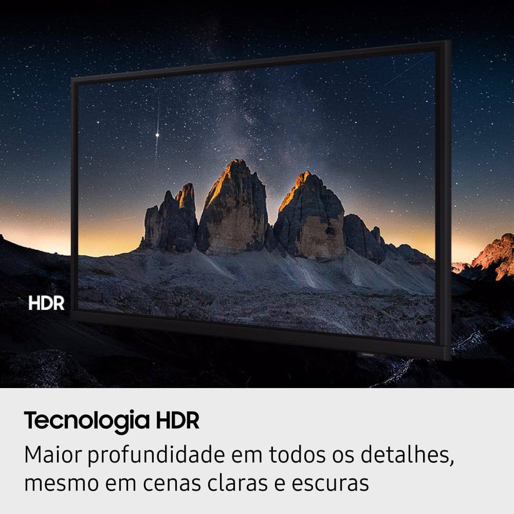 O HDR aumenta o alcance dos níveis de luz na sua TV, proporcionando mais brilho, contraste e detalhes com uma tecnologia que analisa as regiões da tela e ajusta automaticamente o contraste. PurColor transforma o jeito que você assiste a filmes, com mais tons de cores para uma experiência muito mais imersiva. Desfrute de uma imagem mais natural e detalhada com essa tecnologia inovadora que analisa as regiões da tela e ajusta automaticamente o contraste. Não se preocupe com vazamento de dados e senhas ou com invasão de hackers aos seus dispositivos conectados. Com camada múltipla de segurança, a Central de Segurança Knox assegura que todos os seus dispositivos inteligentes estão protegidos. E, com a função Central de Senhas, você pode concentrar todas as suas senhas em um só lugar seguro e fazer logins apenas com um QR Code. Acesse seus conteúdos e apps de streaming na melhor plataforma de TV, com a garantia de atualizações durante 7 anos graças ao One UI Tizen, e tenha uma TV sempre com o que há de mais novo. Com o Samsung TV Plus e apps parceiros*, desfrute de canais de filmes, notícias, infantil, esportes, novelas e músicas, tudo grátis e sem assinatura. A experiência do som 3D permitirá que você fique totalmente imerso no áudio dos seus conteúdos favoritos, como se estivesse no meio da ação. O som da TV aumenta automaticamente à medida que algum ruído no ambiente é identificado, permitindo que nenhum detalhe seja perdido. O som da soundbar é somado aos alto-falantes da TV e, diferente das TVs convencionais, ambos trabalham em conjunto para uma experiência sonora única e incomparável: o Q-Symphony. Com design Slim, a TV se integra ao ambiente para deixá-lo mais moderno e elegante.