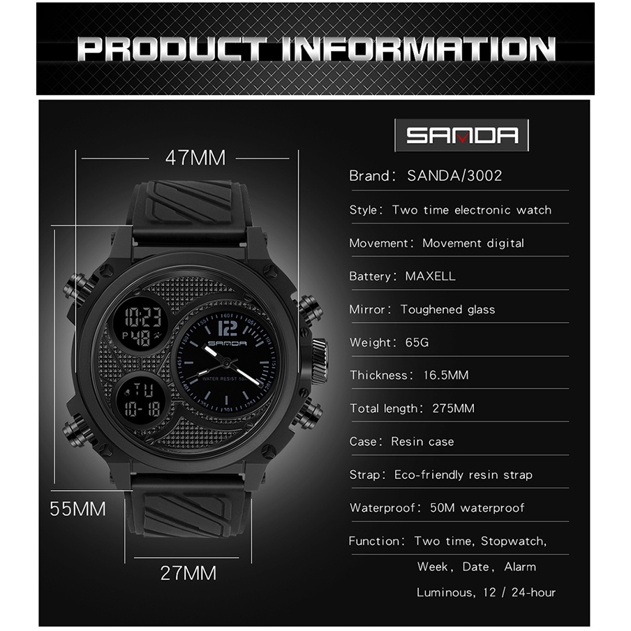 Espessura da Caixa: 16,5mm Largura da faixa de banda: 27mm Tipo de Material da pulseira tipo de Material de pulseira: borracha Formato do estojo: Redondo Tipo de Material da janela do mostrador: PMMA Número do modelo do modelo: 3002 Diâmetro do Mostrador: 47mm Característica: RELÓGIO DE PASSO, Luz Traseira, Resistente a choques, Display LED, Data Automática, Cronógrafo, Resistente à água, Alarme, natação Profundidade de Resistência à Água: 5Bar Tipo de Fecho: Fivela Comprimento da faixa de banda de 17,5 cm Material da caixa: liga Movimento de movimento: Quartzo, exibição dupla, Digital Estilo: Moda e Casual Nome da marca SANDA Origem: China continental Tipo de Item: Relógios de pulso de quartzo Certificação: CE