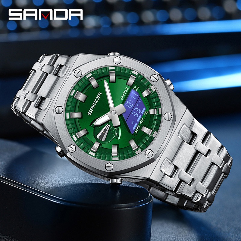 SANDA Nova Série De Tiras De Aço Moda Negócios À Prova D'água Luminosa Relógio Eletrônico Masculino SD3357-2