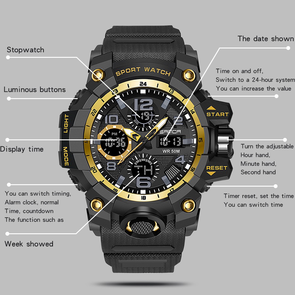 【Sanda Official】Relógio Masculino Esportivo à Prova D'água Relógio Digital De Quartzo Superbrilhante De Luxo Com LED Externo Analógico Militar Relógio Despertador Multifuncional