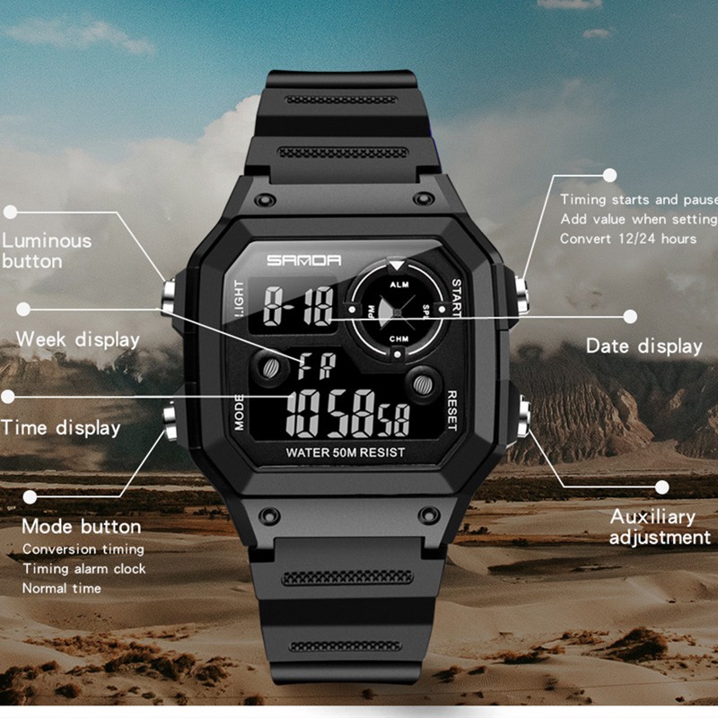 Descrição do produto em inglês após português Nome da marca: SANDA Número do Modelo: 418 Relógio original SANDA Tipo de Projeto: Relógio Digital LED Características: anti-shock, exibição de semana, impermeável, cronômetro, alarme, luminoso, exibição de semana, alarme, cronógrafo, exibição de mês, calendário, indicação de 24 horas Movimento: Quartzo Estilo: casual da moda, esportes, militares, negócios, luxo 100% etiqueta nova e alta qualidade 5ATM/50M impermeável (suporta chuveiro de água fria e natação, não opera o relógio subaquático, não suporta água quente); Material da caixa: borracha Material da cinta: borracha Cinta de borracha de alta qualidade Especificações Diâmetro do mostrador: 41mm Espessura da caixa: 12,5mm Comprimento do relógio: 26 cm Largura de banda: 20mm Incluído no Pacote: 1 x relógio SANDA ************************************************** Description: Brand Name: SANDA Model Number: 418 SANDA original watch Project Type: Digital LED Watch Features: anti-shock, week display, waterproof, stopwatch, alarm, luminous, week display, alarm, chronograph, month display, calendar, 24-hour indication Movement: Quartz Style: fashion casual, sports, military, business, luxury 100% brand new label and high quality 5ATM / 50M waterproof (supports cold water shower and swimming, does not operate the watch underwater, does not support hot water); Case material: rubber Strap material: rubber High quality rubber strap Specifications Dial diameter: 41mm Case thickness: 12.5mm Watch length: 26 cm Bandwidth: 20mm Package Included: 1 x SANDA watch