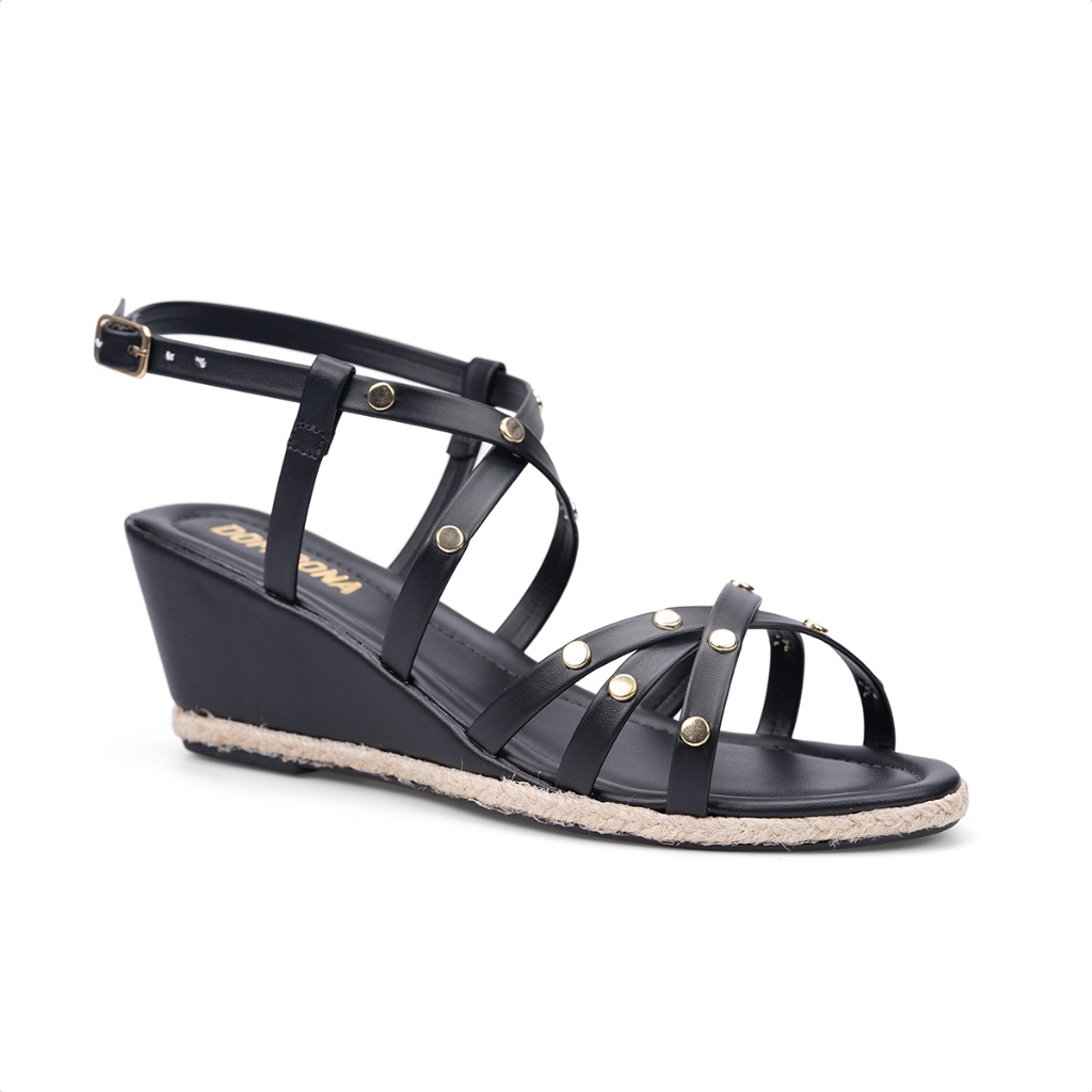Sandália Anabela Tiras Cruzadas Com Tachas Douradas e Fivela Calcanhar