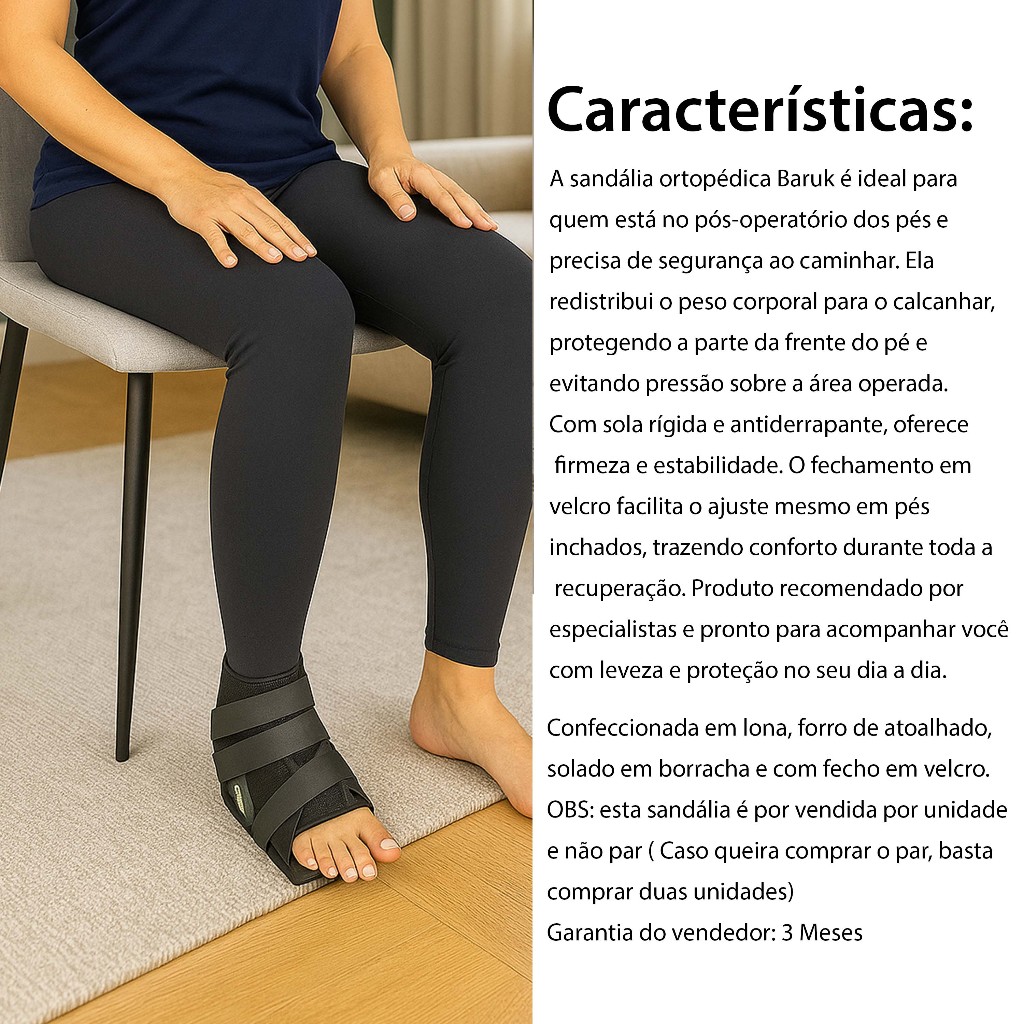 Sandália OrtoFly Baruk 2901 cunha ante pé joanete ortopédica cirúrgica conforto velcro antiderrapante bilateral unissex recuperação hallux valgo pós-operatório leve resistente hospitalar A Sandália Baruk da Ortofly é indicada para proporcionar maior conforto e segurança para pessoas que necessitem de cuidados especiais, no tratamento pós-cirúrgico do joanete. É elaborada com produtos de alta qualidade, que se ajustam perfeitamente ao corpo. Características: - Confeccionada em tecido na cor preta - Possui fecho autoaderente e espuma macia, deixando a parte operada livre. - Bilateral Perguntas Frequentes: P:A Sandália possui lado? R:Não, ela pode ser utilizada em ambos os pés. P:É vendido por unidade ou por par? R:Essa sandália é vendida por unidade, visto ela ser bilateral, caso queira o par, basta comprar duas unidades. P:Posso utilizar a sandália para tratamento de Joanetes? R:Sim, a sandália é recomendada para o tratamento de Hallux Valgus. TAMANHO P Número de Calçado - 33 - 36 TAMANHO M Número de Calçado - 37 - 39 TAMANHO G Número de Calçado - 40 - 42 TAMANHO GG Número de Calçado - 43 - 44 Conteúdo: 01 Sandália ortopédica Baruk Ortofly