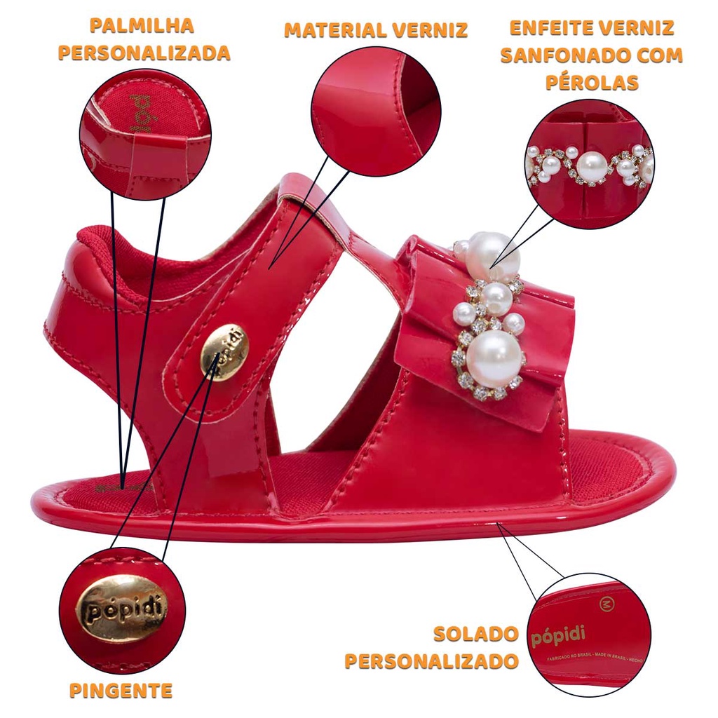 SANDÁLIA BEBÊ Sandalinha bebê leve e confortável, calce fácil com segurança e estilo para as meninas. Perfeita para dias mais frescos. DESCRIÇÃO Confeccionada em Verniz, com forração soft, super confortável e palmilha em EVA com espuma de excelente qualidade. Possui solado personalizado e fechamento prático, facilitando o calce. DETALHES DO PRODUTO Material Externo: Sintético Material Interno: Tecido Material da Palmilha: EVA Material da Sola: Sintético Embalagem: Caixa individual Nós da Pópidi cuidamos com carinho da relação pré e pós-venda, afinal a satisfação de nossos clientes é muito importante para nós! ATENDIMENTO: Segunda à sexta: 07:00 às 19:00 Sábado: 09:00 às 13:00 TABELA DE MEDIDAS P - Nº 13/14 - 8,5 cm M - Nº 15/16 - 10,0 cm G - Nº 17/18 - 11,0 cm COMO MEDIR Coloque o pé em cima de uma folha de papel e risque em volta dele com um lápis ou caneta. Meça o comprimento do topo até a base do contorno e adicione 0,5 cm de folga. LIMPEZA E CONSERVAÇÃO Evite usar substâncias abrasivas como álcool, detergentes ou solventes nos calçados. Nunca os mergulhe na água, os deixe de molho ou lave na máquina. A secagem dos produtos deve ser feita à temperatura ambiente e na sombra, nunca no sol ou em máquinas. SOBRE A EMPRESA Visão Estar em constante expansão e inovação, de uma forma consistente e arrojada. Missão Proporcionar o bem estar dos nossos clientes, satisfazendo-os em um ambiente agradável e cortês com produtos a preços justos e de qualidade. Valores Respeito, Dedicação, Conexão e Atitude. Boas compras e volte sempre!!!