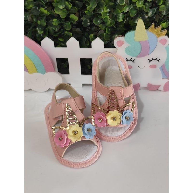 Sandália Bebê Unicórnio Luxo Feminina RN | Sapatinho Confortável Antiderrapante com Flores | Presente para Recém Nascido