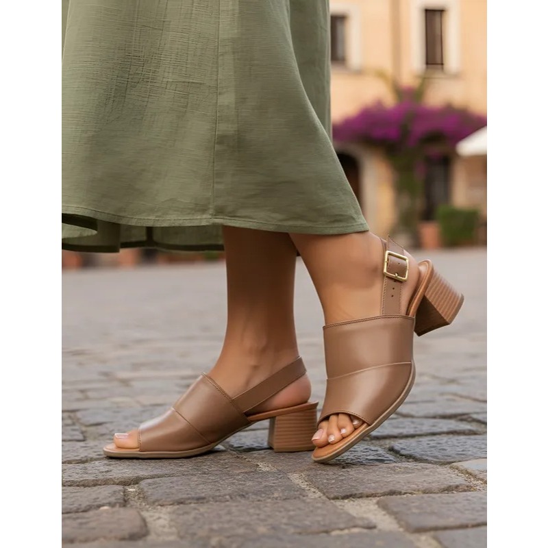 Sandália Em Couro Salto De Madeira Flor D'Couro Dia Dia Moderna Conforto Elegante