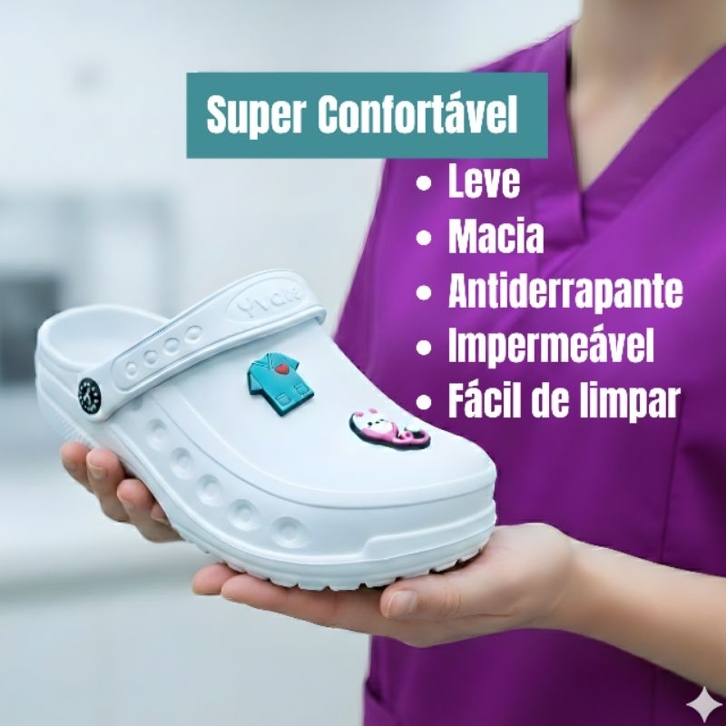 🏥 Sandália Babuche Profissional Fechado Enfermagem Hospitalar Impermeável Antiderrapante Leve Confortável Tipo Sapato Fechado O Sapato Babuche Profissional Fechado** foi desenvolvido especialmente para profissionais da área da saúde que passam longas horas em pé e precisam de **conforto, segurança e praticidade no dia a dia hospitalar**. Ideal para **enfermeiras, técnicas de enfermagem, cuidadoras, profissionais de clínica, hospital, laboratório e consultório**, ele oferece proteção, leveza e fácil higienização. ### ✅ Principais Benefícios: ✔️ **Modelo fechado** – Maior proteção para os pés no ambiente hospitalar ✔️ **Impermeável** – Fácil de limpar e resistente à umidade ✔️ **Solado antiderrapante** – Mais segurança em pisos lisos e molhados ✔️ **Extremamente leve** – Não pesa nos pés durante o plantão ✔️ **Super confortável** – Ideal para longas jornadas ✔️ **Material macio e flexível** – Melhor adaptação aos pés --- ### 👩⚕️ Indicado para: * Enfermagem * Técnicas de enfermagem * Hospitais * Clínicas * Laboratórios * Casas de repouso * Cuidadores de idosos * Área da saúde em geral Atenção: A forma do nosso Sapato é grande, por isso recomendamos a compra de um número menor do que o que você costuma usar. Tabela de Medidas (solado aproximado)** Use como referência para garantir o melhor ajuste: 34 – 22,5 cm** Calça 34 compre 34 35 – 23,0 cm** Calça 35 compre 34 36 – 23,5 cm** Calça 36 compre 35 37 – 24,5 cm**. Calça 37 compre 36 38 – 25,0 cm** Calça 38 compre 37 39 – 25,5 cm** Calça 39 compre 38 Calça 40 compre 39 💬 Ficou com dúvidas? Nossa equipe está à disposição para ajudar pelo chat!