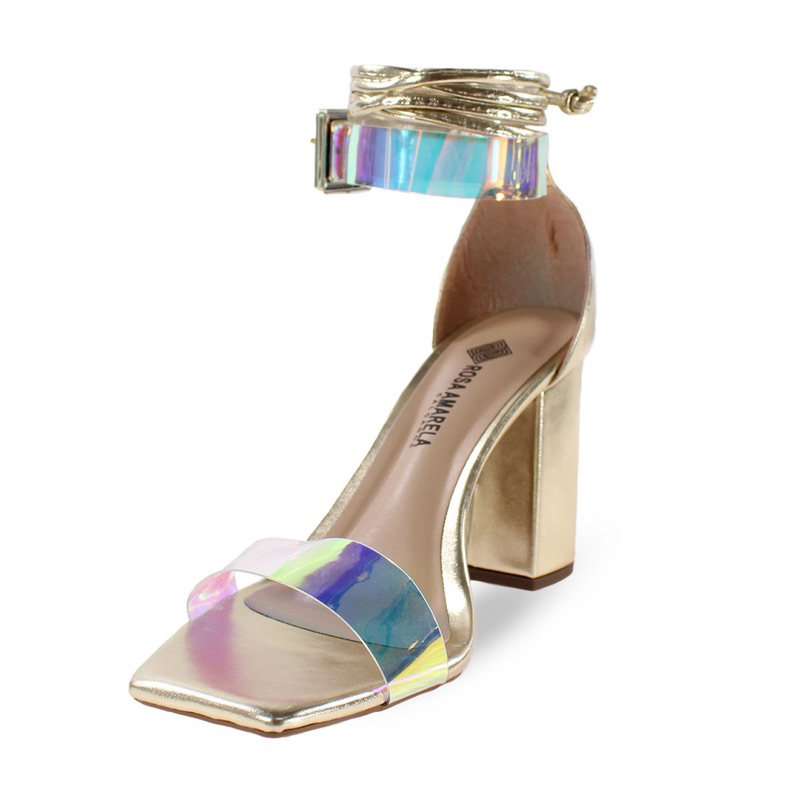 Sandália Feminina Dourada Salto Bloco 8,5cm Confort Vinil Holográfica 2 em 1 Luxo Tendência Primavera/Verão Blogueiras.