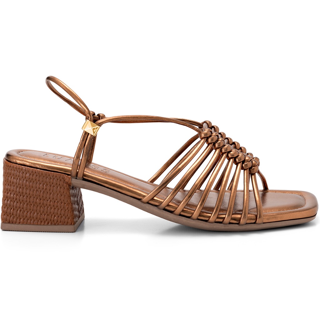 Sandália Feminina Lumiss Bico Quadrado Tramado Salto Bloco Baixo Metalizado Confortável Bronze