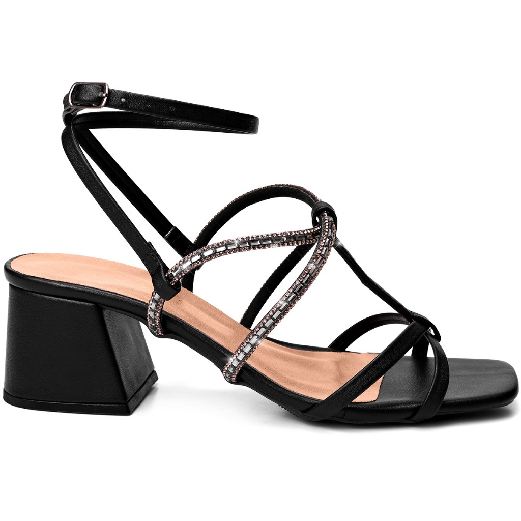 Sandália Feminina Lumiss Confortável Salto Baixo Bloco Bico Quadrado Strass Brilho Preto