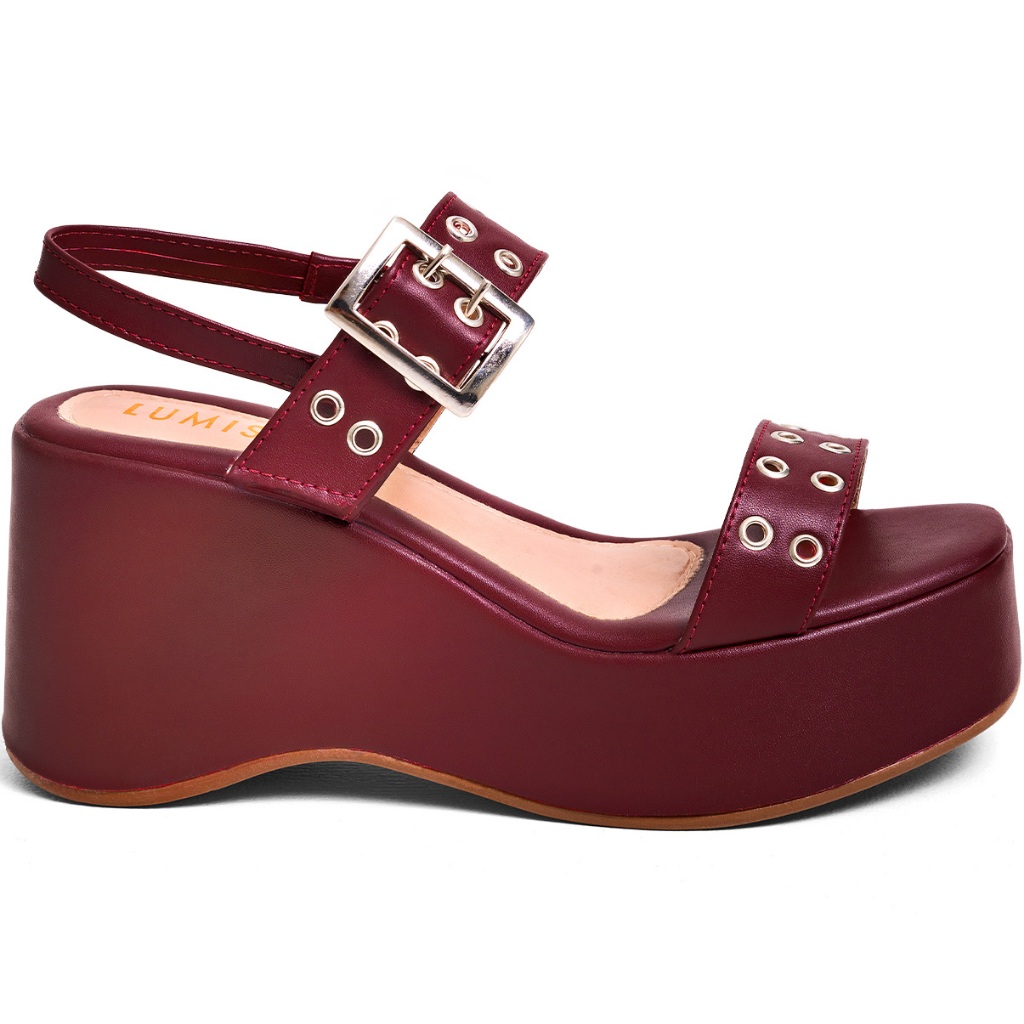 Sandália Feminina Lumiss Fivela Ilhós Anabela Plataforma Confortável Vermelho Marsala