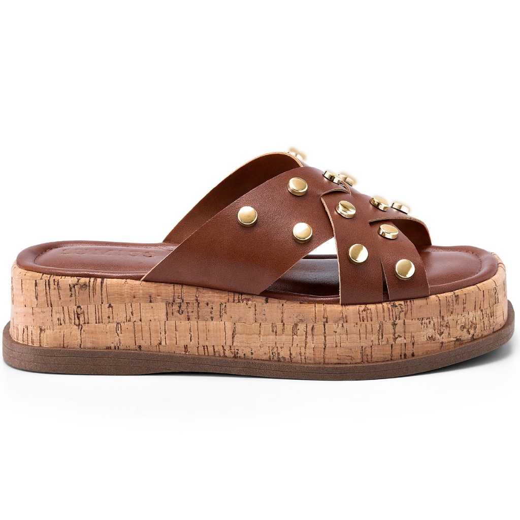 Sandália Feminina Lumiss Flatform Tachas Dourada Confortável Caramelo