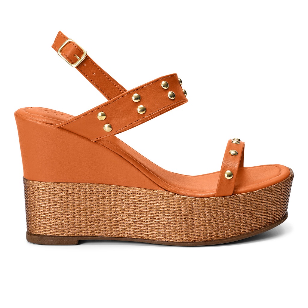Sandália Feminina Lumiss Juta Tachas Anabela Confortável Plataforma Alta Caramelo