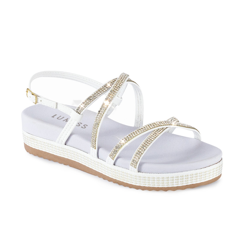 Sandália Feminina Lumiss Papete Strass Brilho Cristal Confortável Tiras Flatform Moda Salto Rasteira