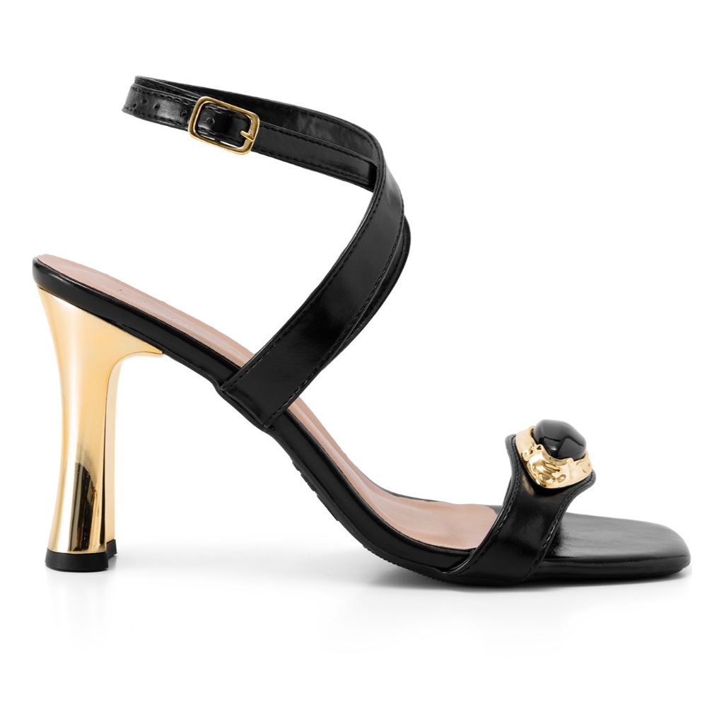 Sandália Feminina Lumiss Salto Alto Bloco Dourado Blogueira Enfeite Pedra Preto