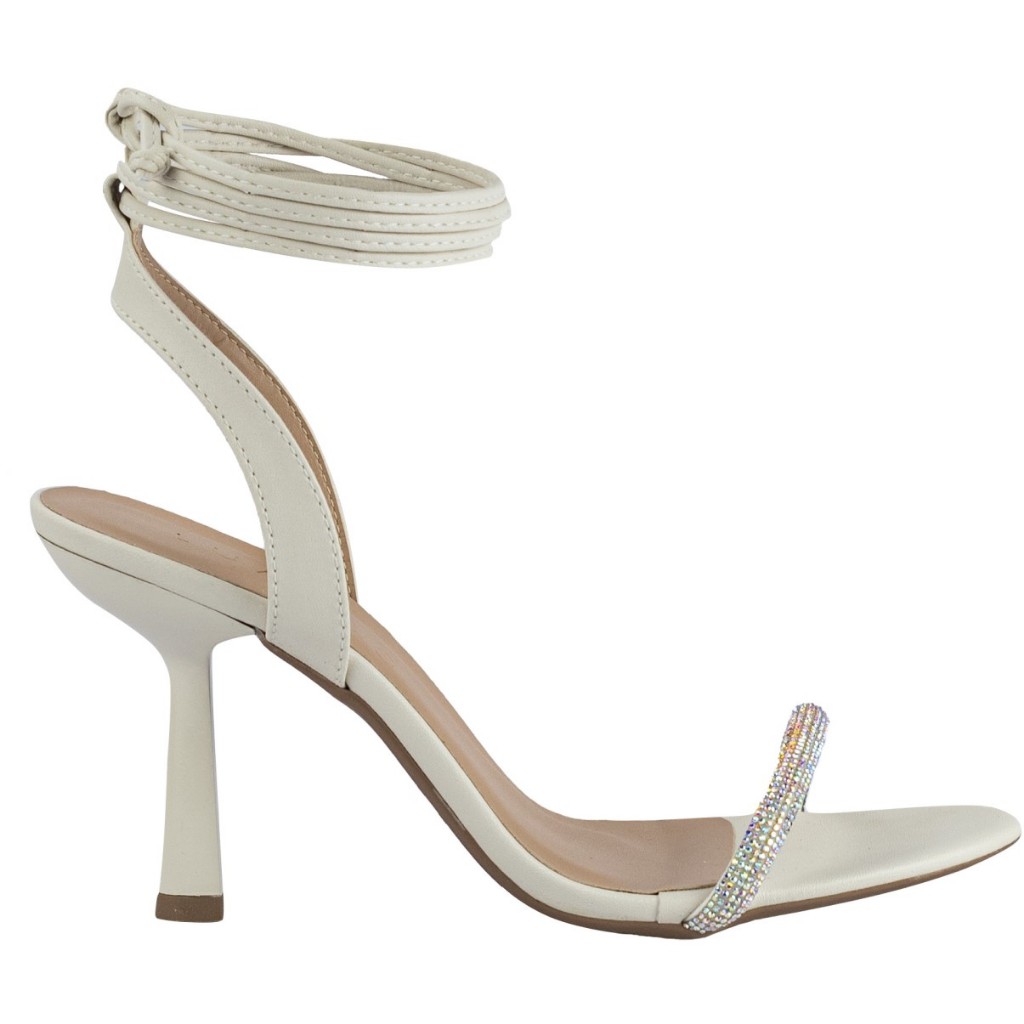 Sandália Feminina Lumiss Salto Alto Fino Confortável Amarração Strass Brilho Off White