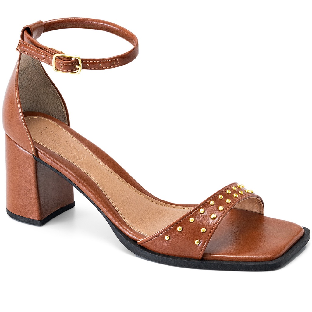 Sandália Feminina Lumiss Salto Baixo Bloco Tachas Bico Quadrado Fivela Caramelo