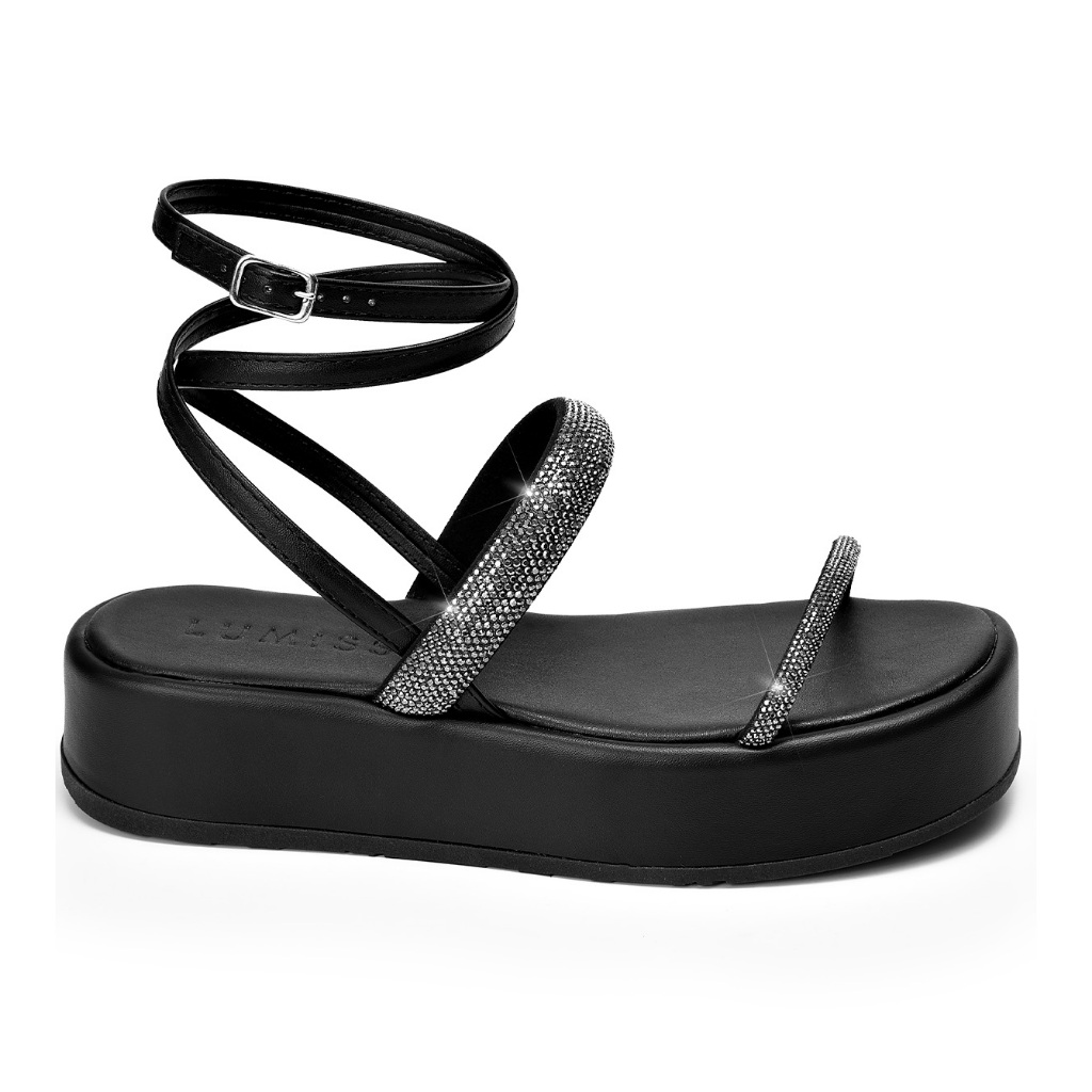 Sandália Feminina Lumiss Strass Brilho Confortável Flatform Fivela Preto