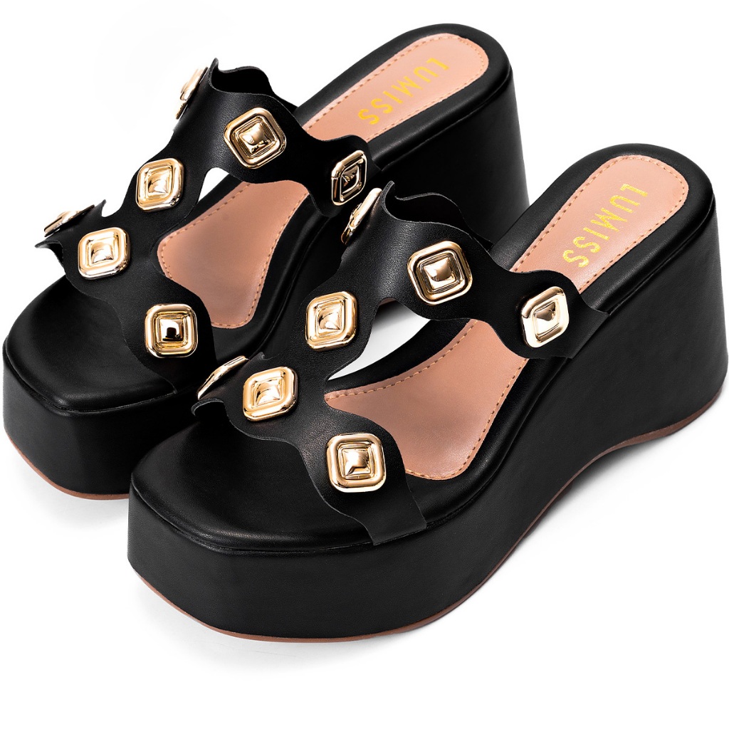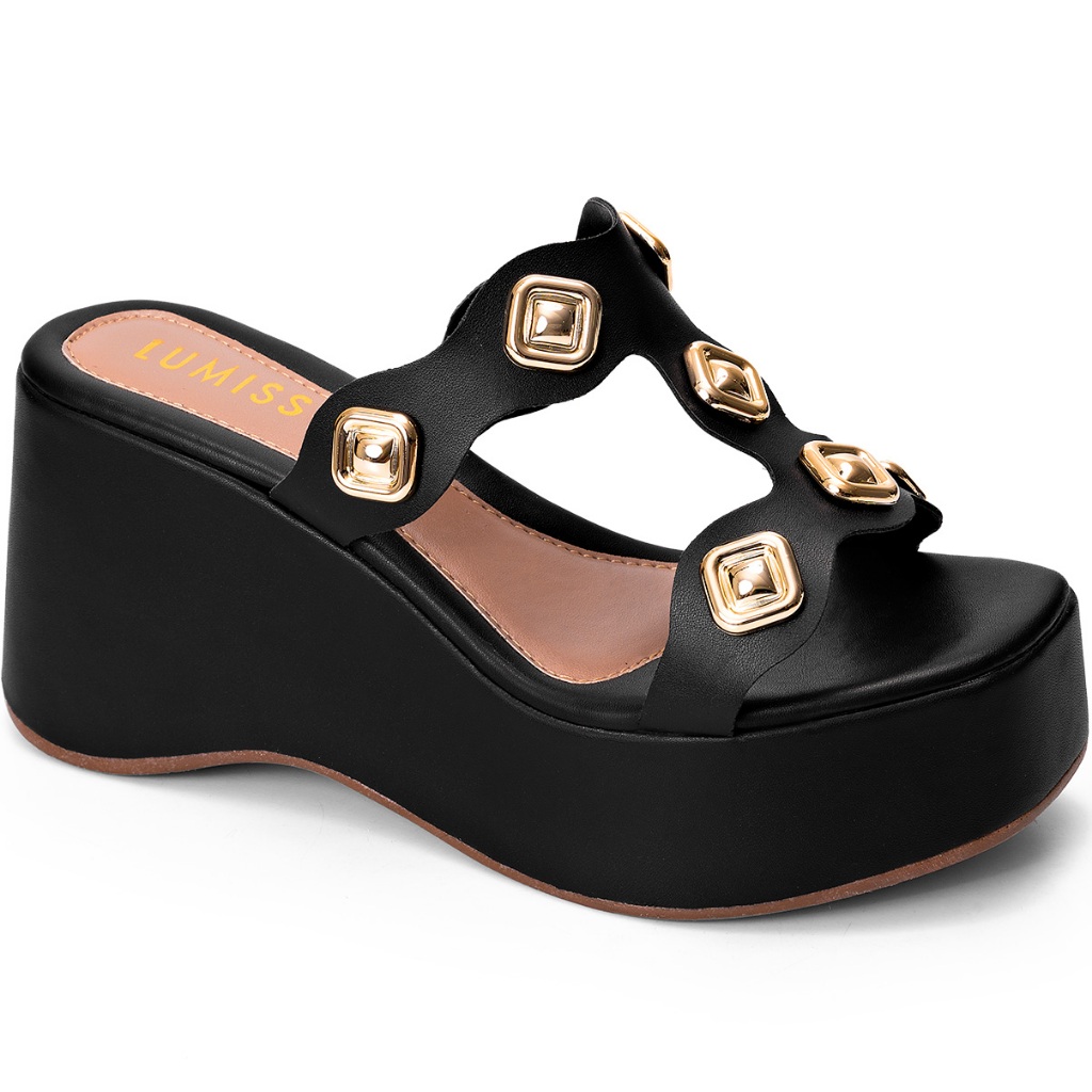 Sandália Feminina Lumiss Tamanco Tachas Anabela Confortável Plataforma Preto