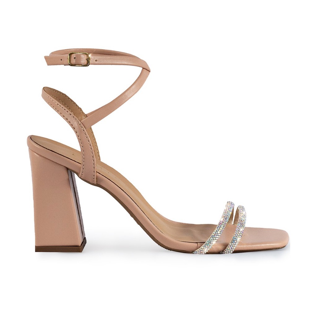 Sandália Feminina Lumiss Tiras Strass Brilho Salto Alto Bloco Grosso Confortável Nude