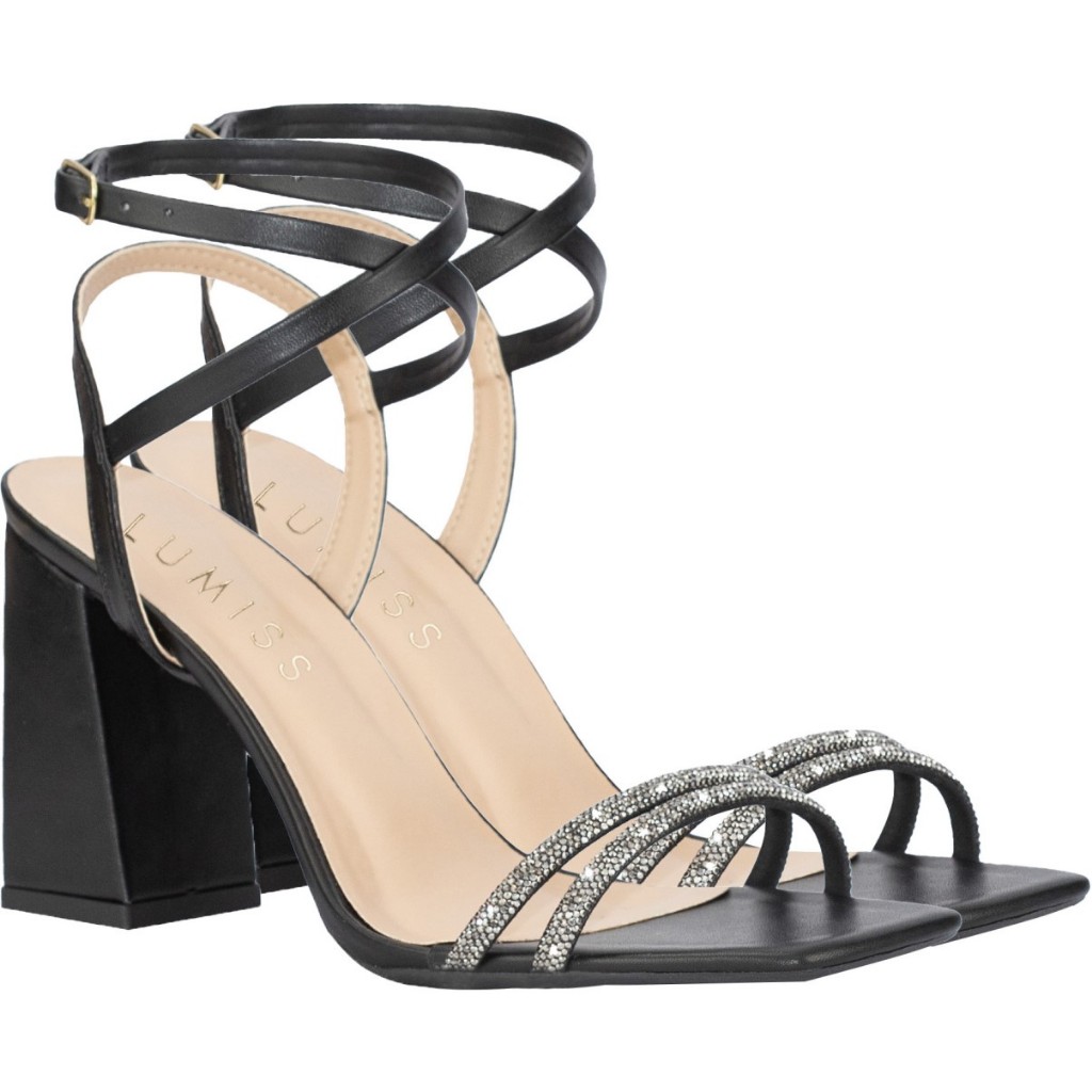 Sandália Feminina Lumiss Tiras Strass Brilho Salto Alto Bloco Grosso Confortável Preto