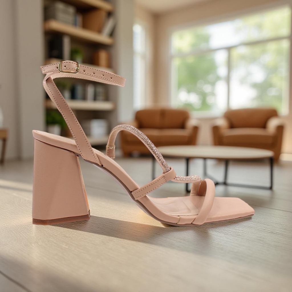 Sandália Feminina Nude Salto Bloco 7,5cm Strass Calcado Confortável Elegante Moda Moderno