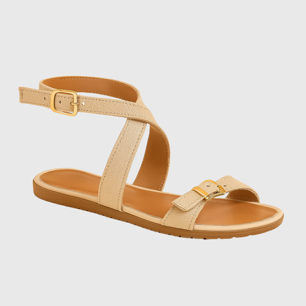 Sandália Feminina Rasteira Fivela Dourada Estilo Conforto Casual Detalhe Tira Tornozelo Gabi