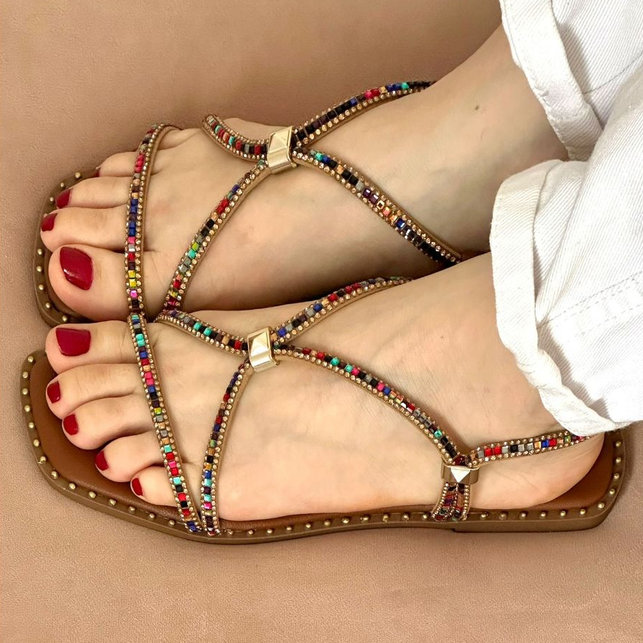 Sandália Feminina Rasteirinha Stass Colorido Pedraria Chinelo Confortável e Macia Verão Moda Casual