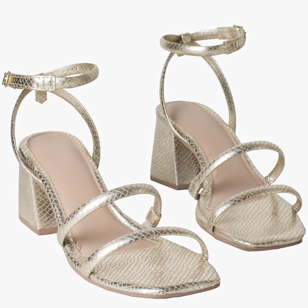 Sandália Feminina Salto Bloco Quadrado Alto Metalizado Dourado Detalhe Tiras Confortável Casual AC