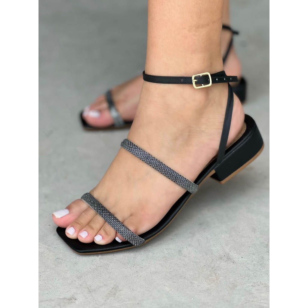 Sandália Feminina Salto Bloco Tira Strass Com Traseira Palmilha Confort