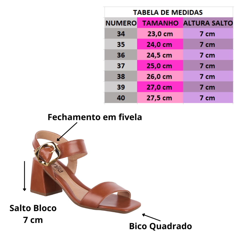 + Cor - Cor original da foto do produto. + Material - Sintético PU + Peso - 380 g. + Solado - PVC antiderrapante + Palmilha - Com EVA que traz conforto + Embalagem - Cada produto vai em sua própria caixa. TABELA DE MEDIDAS: 34- 23,0 CM 35- 24,0 CM 36- 24,5 CM 37- 25,0 CM 38- 26,0 CM 39- 27,0 CM 40- 27,5 CM ALTURA DO SALTO: 7 CM A Sandália Munita combina elegância e conforto em um design versátil que transita perfeitamente entre o casual e o sofisticado.Com salto bloco de 7,0 cm, proporciona estabilidade e bem-estar ao caminhar. O bico quadrado trás uma versão moderna, atual e sofisticado. Com ajuste prático e tendo uma fivela com um designer diferente faz toda a diferença no modelo, é uma peça que valoriza o visual sem abrir mão do bem-estar. Produzida em napa sintético de alta qualidade. Disponível nas cores preto, marrom e caramelo, é a escolha certa para festas, ocasiões especiais ou para elevar produções do dia a dia. CONSERVAÇÃO: * Para conservar o seu modelo novo e bonito por muito mais tempo é fundamental seguir algumas recomendações: - A limpeza deve ser feita com sabão neutro e pano úmido e não deve ficar de molho. Não usar nenhuma fonte de calor para secar. Guardar em local sem umidade e deixar descansar na sombra por 12 horas após o uso. - Não utilize Máquina de lavar e secar. - Independente do material do seu sapato, não esfregue com força ou passe esponjas grossas. - Caso alguma dessas indicações não forem cumpridas, isso poderá danificar os materiais, a cor e a textura do seu calçado.