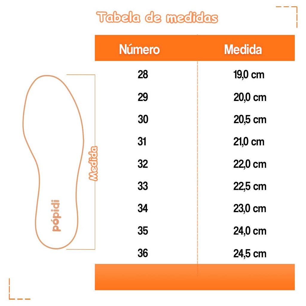 A sandália de saltinho é um clássico que não sai de moda. Modelinho super delicado e confortável que traz todo encanto para os looks femininos. DESCRIÇÃO Estilo salto, confeccionada em material sintético com palmilha estofada e confortável. Possui um saltinho com 2,5 cm de altura, fechamento com zíper no calcanhar e solado antiderrapante. DETALHES DO PRODUTO Material Externo: Sintético Material Interno: Sintético Material da Sola: PVC Material da Palmilha: Sintético dublado com espuma Estilo: Saltinho Fechamento: Zíper Embalagem: Caixa individual Nós da Pópidi cuidamos com carinho da relação pré e pós-venda, afinal a satisfação de nossos clientes é muito importante para nós! Atendimento: Segunda à sexta: 07:00 às 18:00 Sábado: 09:00 às 13:00 TABELA DE MEDIDAS 28 ------ 19,0 cm 29 ------ 20,0 cm 30 ------ 20,5 cm 31 ------ 21,0 cm 32 ------ 22,0 cm 33 ------ 22,5 cm 34 ------ 23,0 cm 35 ------ 24,0cm 36 ------ 24,5 cm COMO MEDIR Coloque o pé em cima de uma folha de papel e risque em volta dele com um lápis ou caneta. Meça o comprimento do topo até a base do contorno e adicione 0,5 cm de folga. LIMPEZA E CONSERVAÇÃO Evite usar substâncias abrasivas como álcool, detergentes ou solventes nos calçados. Nunca os mergulhe na água, os deixe de molho ou lave na máquina. A secagem dos produtos deve ser feita à temperatura ambiente e na sombra, nunca no sol ou em máquinas. SOBRE A EMPRESA Visão Estar em constante expansão e inovação, de uma forma consistente e arrojada. Missão Proporcionar o bem estar dos nossos clientes, satisfazendo-os em um ambiente agradável e cortês com produtos a preços justos e de qualidade. Valores Respeito, Dedicação, Conexão e Atitude.