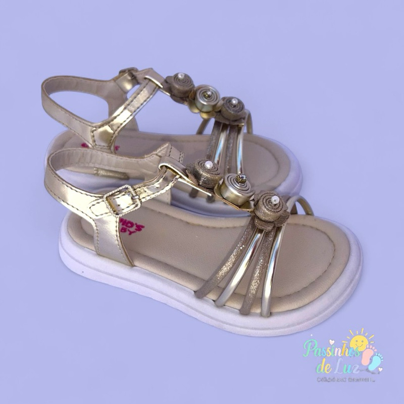 Deixe sua pequena brilhar com essa sandália encantadora! Com design delicado, flores decorativas e um toque de brilho no centro, ela é perfeita para ocasiões especiais ou para dar aquele charme no dia a dia Solado branco antiderrapante para maior segurança Três flores decorativas com pedrinha brilhante no centro Fecho com fivela ajustável no tornozelo Ideal para passeios, festas e uso diário