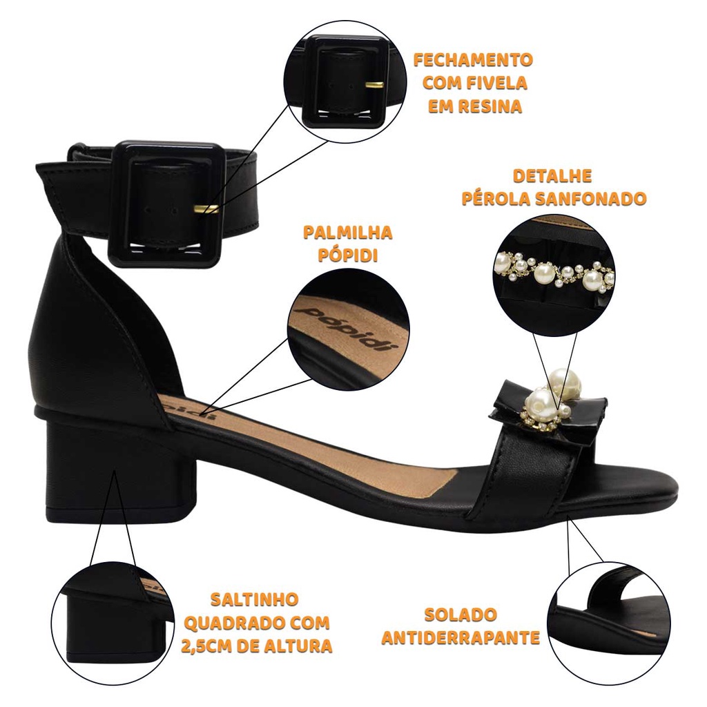 A sandália de saltinho é um clássico que não sai de moda. Modelinho super delicado e confortável que traz todo encanto para os looks femininos. DESCRIÇÃO Estilo salto, confeccionada em material sintético com palmilha estofada e confortável. Possui um saltinho com 2,5 cm de altura, fechamento com fivela em resina e solado antiderrapante. DETALHES DO PRODUTO Material Externo: Sintético Material Interno: Sintético Material da Sola: PVC Material da Palmilha: Sintético dublado com espuma Estilo: Saltinho Fechamento: Fivela Embalagem: Caixa individual Nós da Pópidi cuidamos com carinho da relação pré e pós-venda, afinal a satisfação de nossos clientes é muito importante para nós! Atendimento: Segunda à sexta: 07:00 às 19:00 Sábado: 09:00 às 13:00 TABELA DE MEDIDAS 28 --- 19,0 cm 29 --- 20,0 cm 30 --- 20,5 cm 31 --- 21,0 cm 32 --- 22,0 cm 33 --- 22,5 cm 34 --- 23,0 cm 35 --- 24,0cm 36 --- 24,5 cm COMO MEDIR Coloque o pé em cima de uma folha de papel e risque em volta dele com um lápis ou caneta. Meça o comprimento do topo até a base do contorno e adicione 0,5 cm de folga. LIMPEZA E CONSERVAÇÃO Evite usar substâncias abrasivas como álcool, detergentes ou solventes nos calçados. Nunca os mergulhe na água, os deixe de molho ou lave na máquina. A secagem dos produtos deve ser feita à temperatura ambiente e na sombra, nunca no sol ou em máquinas. SOBRE A EMPRESA Visão Estar em constante expansão e inovação, de uma forma consistente e arrojada. Missão Proporcionar o bem estar dos nossos clientes, satisfazendo-os em um ambiente agradável e cortês com produtos a preços justos e de qualidade. Valores Respeito, Dedicação, Conexão e Atitude. Boas compras e volte sempre!!!