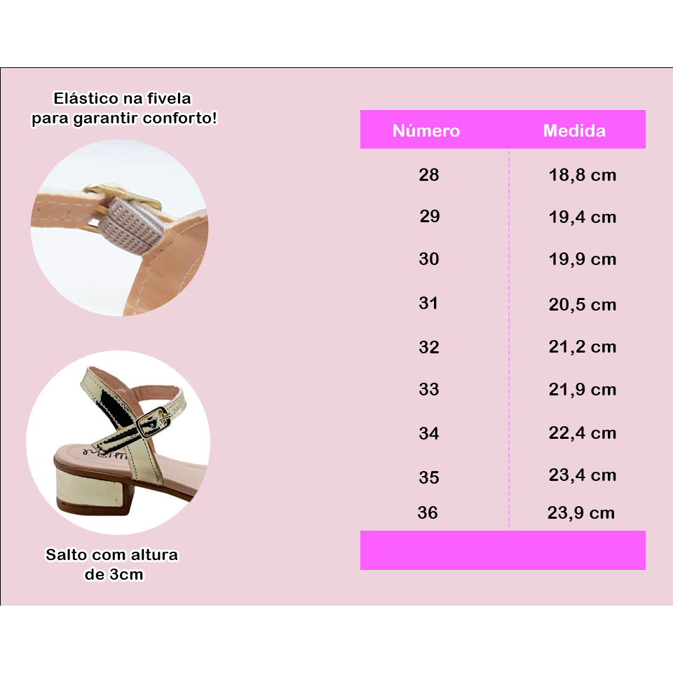 Nós buscamos oferecer produtos com qualidade e segurança para os pezinhos delicados das crianças, calçados confeccionados com amor e dedicação, com detalhes para compor o look dos pequenos, com cores básicas mais não menos lindo para o dia-a-dia como cores mais vibrantes para festas *INFORMAÇÕES * Sandálias feitas em material verniz de fácil limpeza com forro interno com toque macio e confortável, todas as sandálias com elástico na fivela proporcionando mais conforto, palmilha fofinha, sola feita em PVC emborrachado na cor crepe leve e confortável, com detalhes bordado a mão, os calçados vão com caixa individual com todo nosso carinho e amor *MEDIDAS* Antes de efetuar a compra, recomendamos medir uma palmilha de um calçado que sirva bem e comparar com as medidas MEDIDAS DAS PALMILHAS: N.o 28---------------------18,8 CM N.o 29---------------------19,4 CM N.o 30---------------------19,9 CM N.o 31---------------------20,5 CM N.o 32---------------------21,2 CM N.o 33---------------------21,9 CM N.o 34---------------------22,4 CM N.o 35---------------------23,4 CM N.o 36---------------------23,9 CM *CUIDADOS COM A LIMPEZA DO SEU CALÇADO MILIIE* - Usar um pano limpo umedecido levemente só com água PURA, -Usar escova de cerdas macias para limpar o solado. -NÃO COLOCAR DIRETAMENTE NA ÁGUA. - Secar na sombra; - Não colocar em máquina de lavar; - Não colocar na secadora; - Não usar sabão ou alvejante COM CLORO. - Não usar nenhuma fonte de calor para secar seu calçado, PODE DANIFICAR ALGUNS COMPONENTES DO CALÇADO. Qualquer dúvida entre nos chame no chat será um prazer atendê-los :)