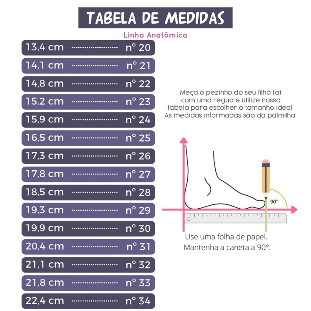 A sandália Anatômica é perfeita para o dia-a-dia dos pequenos. É fácil de calçar, possui solado antiderrapante, palmilha com espuma fofinha que se adapta perfeitamente ao formato natural do pezinho e é confeccionada com materiais que permitem a sua respirabilidade. Vai bem com tudo e é a cara do nosso verão! **********TABELA DE MEDIDAS*********** 20 ------------------ 13,4 cm 21 ------------------ 14,1 cm 22 ------------------ 14,8 cm 23 ------------------ 15,2 cm 24 ------------------ 15,9 cm 25 ------------------ 16,5 cm 26 ------------------ 17,3 cm 27 ------------------ 17,8 cm 28 ------------------ 18,5 cm 29 ------------------ 19,3 cm 30 ------------------ 19,9 cm 31 ------------------ 20,4 cm 32 ------------------ 21,1 cm 33 ------------------ 21,8 cm 34 ------------------ 22,4 cm OBS: À cada medida feita, adicione pelo menos meio centímetro para que o pé fique confortável no calçado. Afinal, nenhum sapato fica exatamente do mesmo tamanho dos pés DETALHES DO PRODUTO Fechamento: Fivela Material Externo: Sintético Material Interno: Têxtil Material da Palmilha: Sintético Material da Sola: Borracha Tr Cor: Branco Dourado Altura do cano: Baixo