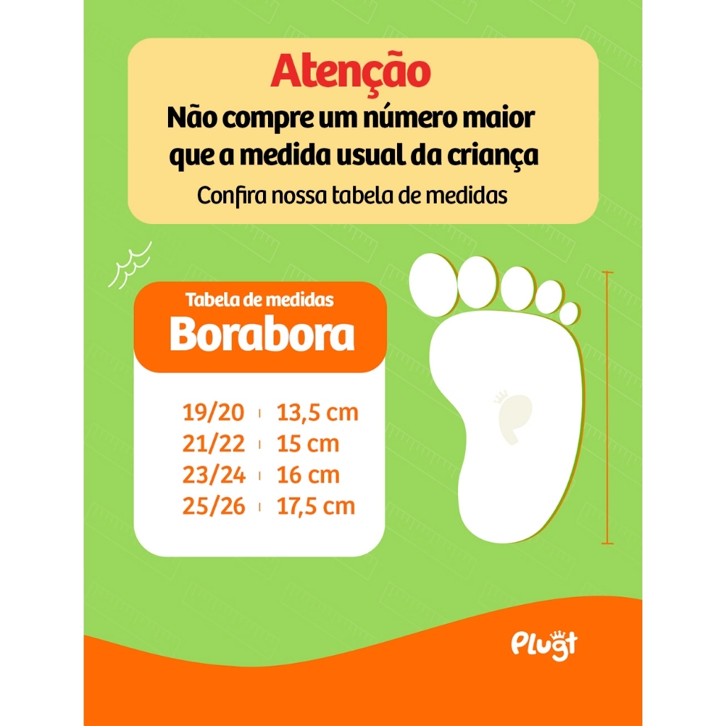 A Papete Infantil Plugt Bora Bora é o modelo ideal para quem busca leveza, conforto e praticidade no dia a dia. Feita com material macio, vegano e sustentável, ela oferece o equilíbrio perfeito entre modernidade e bem-estar, garantindo conforto em cada passo. Com palmilha flexível e tecnologia ARTEC, a papete se adapta ao formato dos pés e proporciona uma pisada leve e agradável. O fechamento com dupla regulagem permite um ajuste perfeito e seguro, enquanto o solado antiderrapante garante estabilidade em qualquer superfície. Linda, leve e colorida, é perfeita para acompanhar todas as aventuras com segurança e muito estilo. Tabela de Medidas – Comprimento da Palmilha (cm) (medida do dedão ao calcanhar) Numeração | Comprimento 19/20 | 13,5 cm 21/22 | 15,0 cm 23/24 | 16,0 cm 25/26 | 17,5 cm Diferencial Plugt: Calçados feitos para a diversão. Super leves, fofinhos e cheios de estilo, perfeitos para acompanhar todas as aventuras com conforto e praticidade. Além disso, são livres de ftalatos, garantindo ainda mais segurança para os pezinhos. Principais Dúvidas: A papete é confortável? Sim, possui palmilha anatômica e tecnologia ARTEC que garante maciez e bem-estar. É leve? Sim, o material injetado é leve e flexível, ideal para o uso diário. É antiderrapante? Sim, o solado garante segurança e estabilidade ao caminhar. É vegana e sustentável? Sim, feita com materiais recicláveis e livres de origem animal. Sobre a Plugt: Desde 2001, a Plugt é referência na criação e produção de calçados infantis injetados no Brasil e em mais de 20 países. Combinamos tecnologia, conforto e design criativo, criando produtos divertidos, seguros e cheios de personalidade. Nossos calçados são feitos com PVC Microexpandido, um material leve, confortável, fácil de lavar e reciclável, contribuindo para um futuro mais sustentável.