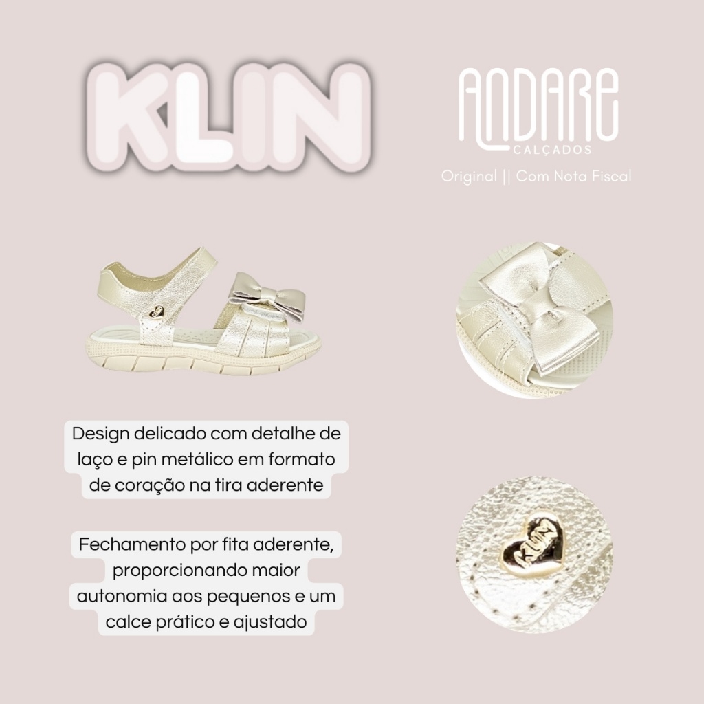 | Sandalia Klin Infantil Feminina Menina Tic Tac Papete Laço Original este produto | R$ 119,99 | 20% | 5.0/5 | 1 |