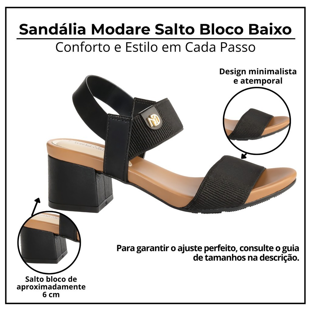 Sandália Modare Feminina Salto Bloco Baixo 5cm Confortável A Sandália Modare foi criada para quem busca elegância e bem-estar em todos os momentos. Com tiras largas e elástico ajustável, o modelo garante praticidade no calce e adaptação perfeita aos pés. O salto em bloco de aproximadamente 5cm proporciona altura na medida certa, com equilíbrio e segurança. Já a palmilha Ultraconforto, com tecnologia anatômica, oferece maciez e absorção de impacto, tornando o uso mais agradável durante todo o dia. O solado emborrachado com frisos antiderrapantes completa o design, ideal para compor desde looks casuais até produções mais sofisticadas. Temos também esse modelo disponível em outras cores, acesse o link para conferir: https://shopee.com.br/product/324536294/40258072051/ Destaques do Produto 🌟 👡 Modelo moderno e versátil 🪶 Palmilha Ultraconforto anatômica 📏 Salto bloco baixo de aproximadamente 5cm 🔒 Elástico no cabedal para ajuste perfeito 👣 Solado emborrachado antiderrapante Tabela de Medidas 📏 34 → 22,5 cm 35 → 23 cm 36 → 24 cm 37 → 24,5 cm 38 → 25 cm 39 → 26 cm 👉 Perfeita para quem deseja conforto, estabilidade e estilo em todos os momentos.