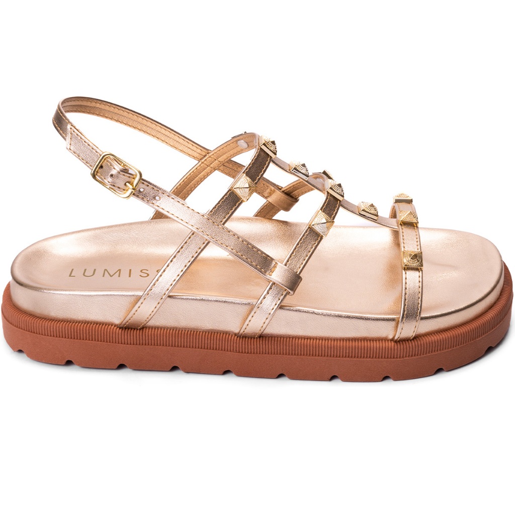 Sandália Papete Feminina Lumiss Spike Pirâmide Fivela Confortável Dourado