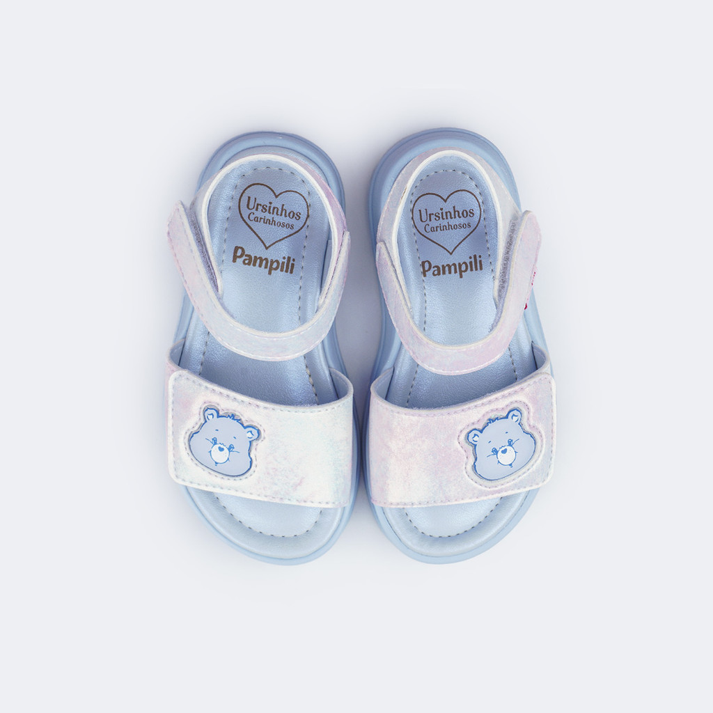 A coleção oficial Pampili + Ursinhos Carinhosos traz de volta personagens que marcaram a infância de muitas gerações em uma linha exclusiva de calçados e acessórios que conectam pais e filhas em histórias repletas de amor, amizade e ternura. Com cores alegres, símbolos nostálgicos e detalhes vibrantes, une conforto, diversão e estilo. Uma linha única para compartilhar memórias e criar novos momentos cheios de afeto.Doce e sonhadora, a ursinha Meus Sonhos inspira esta sandália azul claro com delicadeza. O design lúdico traz a carinha da personagem no cabedal tie dye de cores claras e brilho suave, que deixam o visual ainda mais especial. O fecho duplo de contato garante ajuste personalizado, calce fácil e autonomia para a menina. O modelo possui palmilha anatômica e solado antiderrapante em TR Eco, produzido com 20% de matérias-primas renováveis aliando conforto, flexibilidade e sustentabilidade. O braile no solado reforça a atenção aos detalhes inclusivos que fazem a diferença. Um modelo encantador, pensado para acompanhar os passos das meninas com segurança e bem-estar no dia a dia. Aposte! Use essa papete azul com saias rodadinhas e camiseta para looks delicados e leves. Que tal acessórios de cabelos para deixar o visual ainda mais arrumadinho?