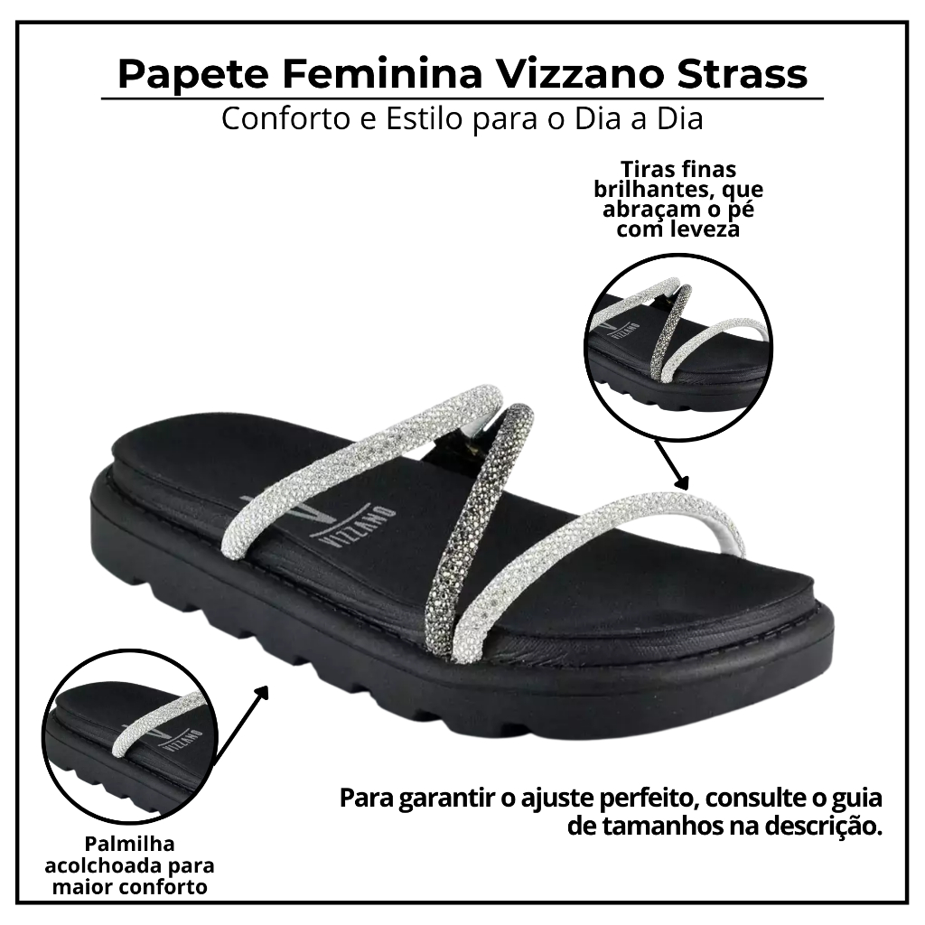 👡 Sandália Papete Vizzano Birken Confortável Original Essa papete Birken da Vizzano é perfeita para quem busca estilo moderno e muito conforto. O detalhe das tiras finas brilhantes dá um toque elegante e fashionista, enquanto o solado tratorado proporciona estabilidade e tendência. Ideal para compor looks casuais ou até mais arrumadinhos com charme extra. ✅ Benefícios 🌟 Tiras finas com acabamento brilhante que destacam o visual 🪶 Solado leve e tratorado, com frisos para ótima aderência 🌿 Palmilha super macia que garante bem-estar no dia a dia 🔒 Ajuste confortável com fivela ou tiras adaptáveis ✨ Design birken moderno e versátil para várias ocasiões 📋 Ficha Técnica 🏷 Marca: Vizzano 👡 Modelo: Papete Birken Confortável 🌟 Detalhe: Tiras finas brilhantes 🌿 Material externo: Sintético de alta qualidade 🪶 Palmilha: EVA macia e anatômica com tecnologia Confy 🚀 Solado: PVC emborrachado tratorado, antiderrapante 📏 Altura do solado: aproximadamente 4 cm ❗ Forma: Normal 🧼 Dicas de Limpeza Passe pano úmido com sabão neutro para manter o brilho das tiras Evite produtos abrasivos ou escovas duras para não riscar o acabamento Não deixe exposta ao sol por longos períodos — pode alterar a cor Seque naturalmente à sombra em local ventilado Guarde em local seco para maior durabilidade 📏 Tabela de Medidas (aproximada) 34 → 22,5 cm 35 → 23,0 cm 36 → 23,5 cm 37 → 24,0 cm 38 → 24,5 cm 39 → 25,0 cm 40 → 25,5 cm