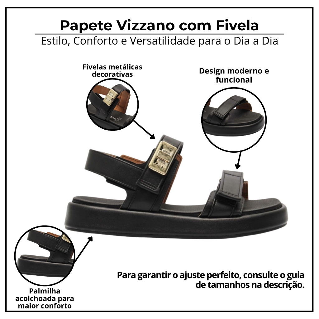 👡✨ Sandália Papete Vizzano Feminina Flats Confortável – Estilo Moderno e Prático A papete Vizzano combina design atual com muito conforto, sendo ideal para quem busca leveza e versatilidade no dia a dia. Possui solado flats macio, tiras largas com detalhe em fivela dourada e fechamento ajustável que garante firmeza ao caminhar. Um modelo moderno que valoriza qualquer look casual. 🌟 Benefícios Exclusivos: 👣 Palmilha acolchoada que oferece conforto prolongado. 🔒 Fechamento em fivela ajustável para melhor segurança. ✨ Detalhe metalizado que dá um toque sofisticado. 💨 Estrutura aberta que permite ventilação natural. 🌿 Material sintético resistente e fácil de limpar. 🧼 Dicas de Conservação: Limpar com pano úmido e sabão neutro. Evitar molhar excessivamente. Secar sempre à sombra. 📌 Ficha Técnica: Marca: Vizzano Modelo: Sandália Papete Feminina Tipo: Flats / Casual / Confortável Material: Sintético Fechamento: Fivela ajustável Palmilha: Macia e acolchoada Solado: Emborrachado, seguro e leve Indicação: Uso diário e passeios 📏 Tabela de Medidas (cm): 34 – 23,0 cm 35 – 23,5 cm 36 – 24,0 cm 37 – 24,5 cm 38 – 25,3 cm 39 – 25,5 cm 40 – 26,0 cm 💎 Diferenciais: Sandália papete flats da Vizzano com design moderno, detalhe em fivela dourada, palmilha macia e solado confortável para todos os momentos.